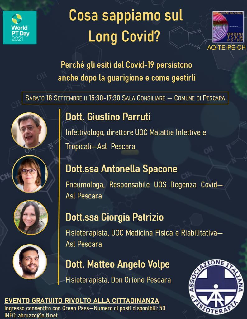 Siamo lieti di invitare tutti i colleghi fisioterapisti e tutta la cittadinanza a questo evento sul tema del Long Covid organizzato in collaborazione con la Cda Fisioterapisti AQ-CH-PE-TE e AIFI Sezione Abruzzo.