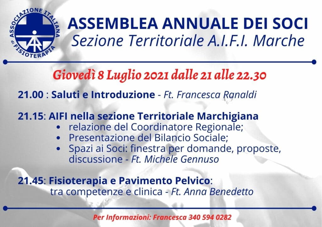 Giovedì 8 Luglio 2021 dalle ore 21.00 alle ore 22.30 si terrà l’assemblea annuale dei soci AIFI sezione territoriale Marche, in modalità online su piattaforma GoToWebinar (il link nella newsletter)