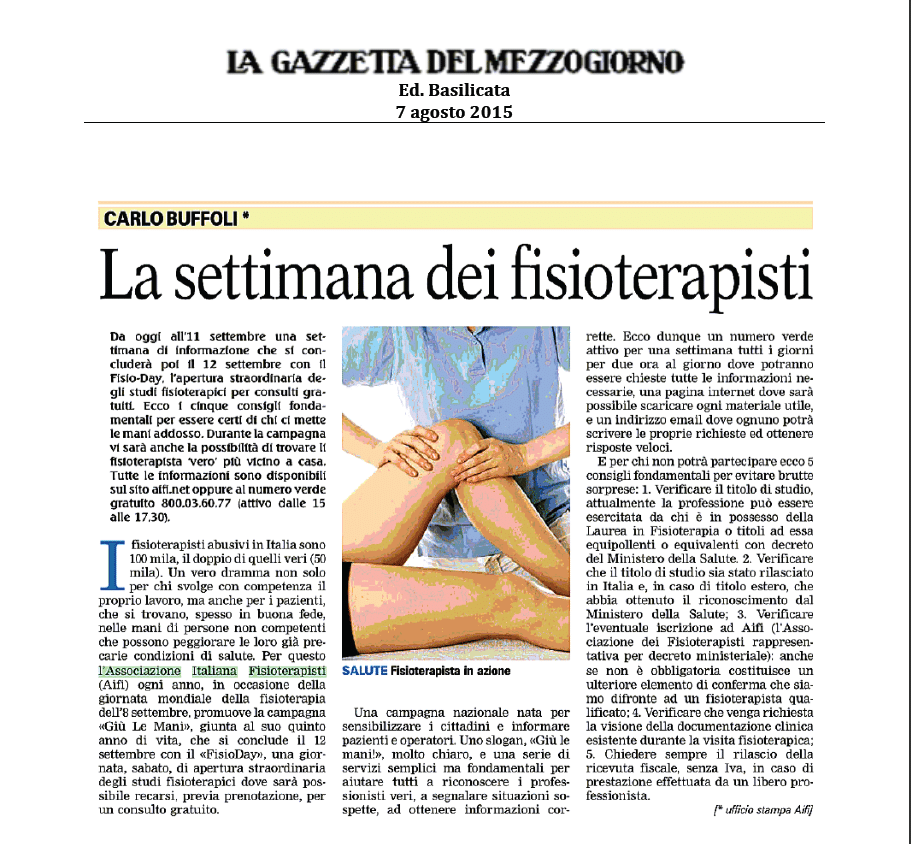 Inizia oggi la settimana della campagna “GIÙ LE MANI“. Tutto si concluderà il 12 settembre con la giornata del “FISIO...