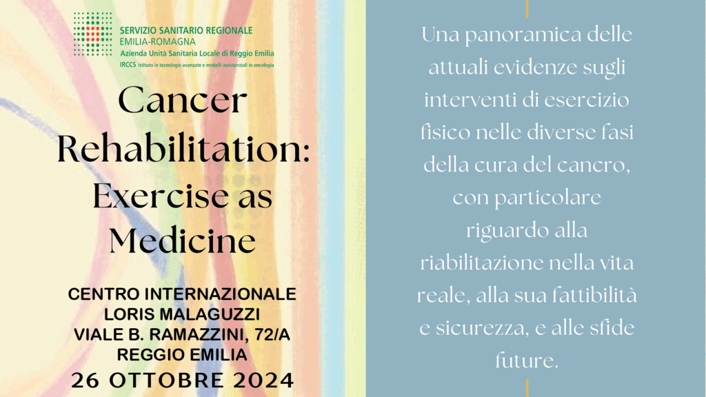 Siamo lieti di invitarvi a un evento imperdibile per tutti i professionisti della fisioterapia e delle scienze riabilitative: Cancer Rehabilitation: Exercise as Medicine. Questo convegno si terrà il 26 ottobre 2024 presso il Centro Internazionale Loris Malaguzzi a Reggio Emilia (viale B. Ramazzini, 72/A).
