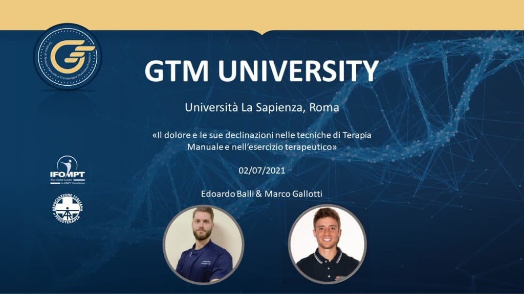 Edoardo Balli e Marco Gallotti, Referenti del Gruppo di Terapia Manuale e Fisioterapia Muscoloscheletrica organizzano un seminario formativo per gli studenti del CdL in Fisioterapia del 2°anno dell’Università La Sapienza di Roma relativo alla tematica del: “Dolore e le sue declinazioni nelle tecniche di Terapia Manuale e nell’esercizio terapeutico“.