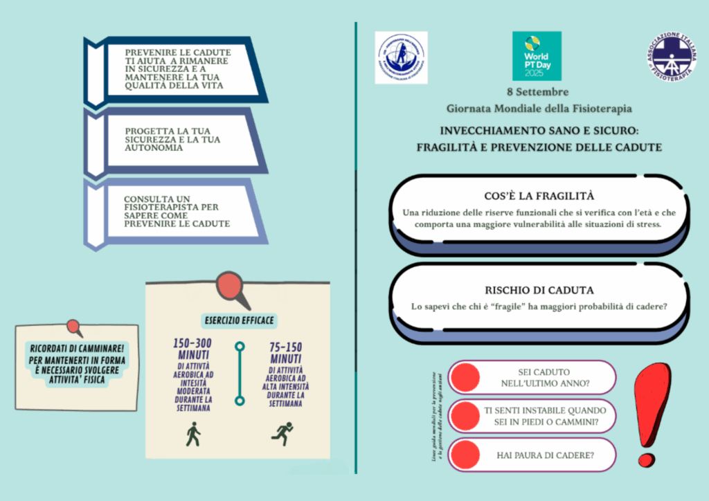 La Giornata Mondiale della Fisioterapia, che si celebra ogni anno l’8 settembre, quest’anno è dedicata al ruolo della fisioterapia e dell’attività fisica nell’invecchiamento sano, con particolare attenzione alla prevenzione della fragilità e delle cadute.