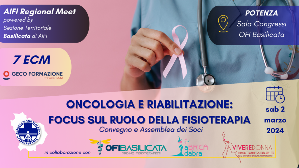 AIFI ST Basilicata in collaborazione con OFI Basilicata, Ass. aBRCAdabra e l’Ass. Vivere Donna, organizza un Convegno sulla Riabilitazione Oncologica sabato 2 Marzo presso la sede dell’Ordine dei Fisioterapisti di Basilicata a Potenza.