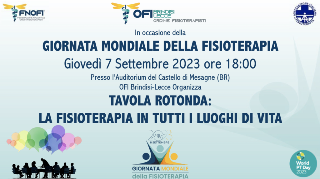Giovedì 7 settembre, in occasione della Giornata Mondiale della Fisioterapia, l’OFI di Brindisi e Lecce in collaborazione con la Sezione Territoriale Puglia di AIFI, ha organizzato una Tavola Rotonda presso l’Auditorium del Castello di Mesagne (BR).