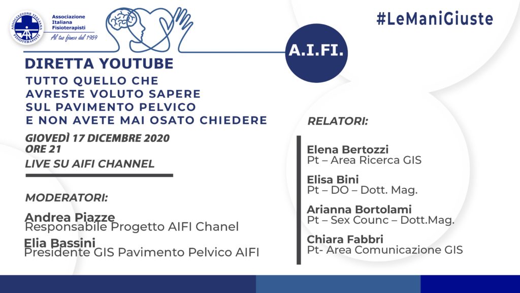 Un viaggio alla scoperta delle problematiche del Pavimento Pelvico assieme ai Dirigenti del neo-nato GIS Fisioterapia e Riabilitazione del Pavimento Pelvico. Dalla prevenzione e gestione dell’incontinenza urinaria femminile alle problematiche legate al dolore cronico, dalla presa in carico della stipsi alla necessità di intervenire sulle problematiche relative alla sessualità della persona. Tutto questo si può! E a raccontarlo saranno le Fisioterapiste del GIS FR PP.